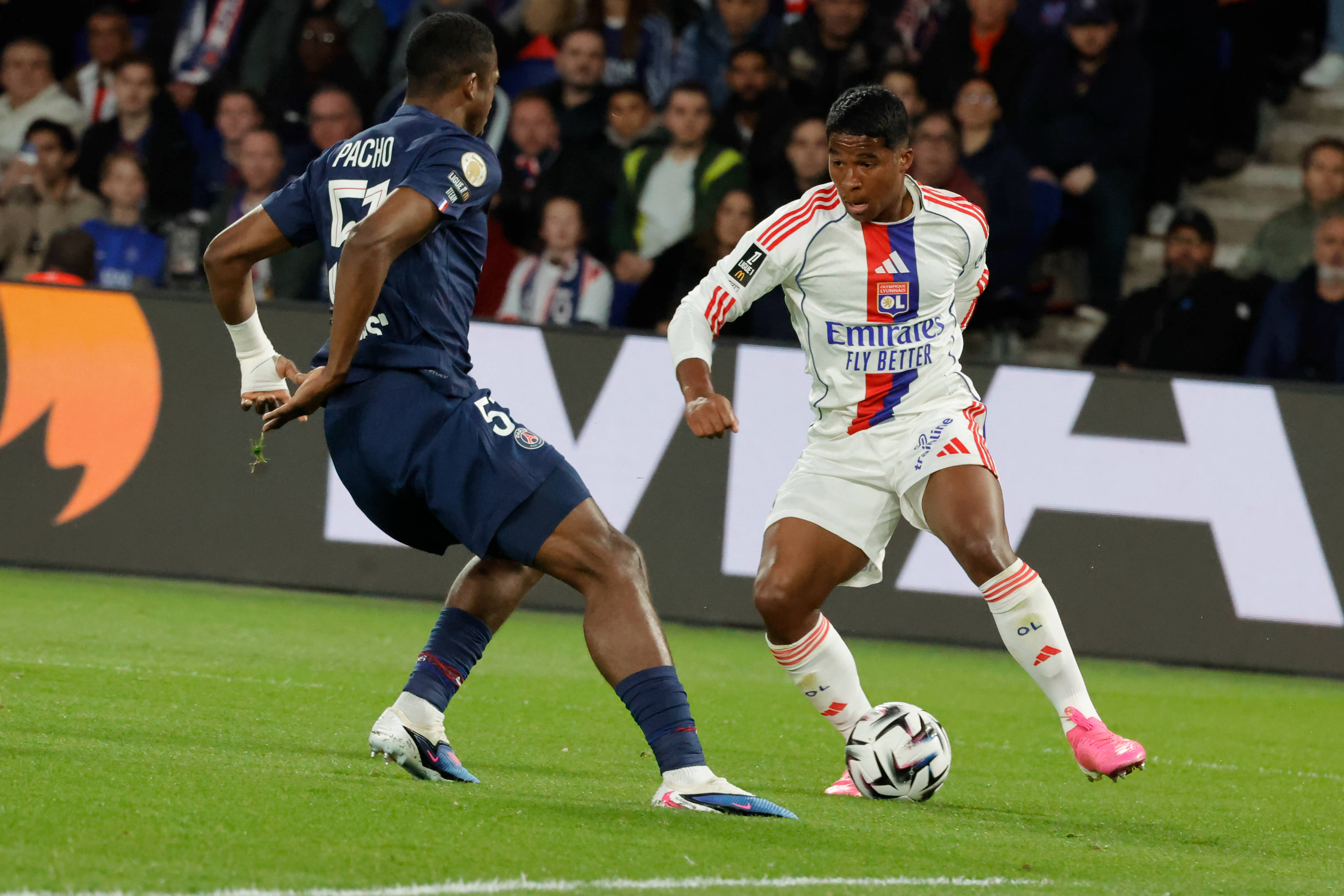 4月19日,巴黎圣日耳曼队球员帕乔(左)和里昂队球员恩德里克在比赛中拼抢。 新华社发(亨利·施瓦茨摄)