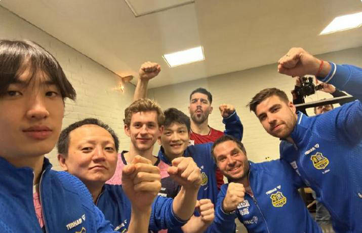 樊振东欧冠15分钟速胜111开局,模仿C罗庆祝 与队友共享荣耀时刻